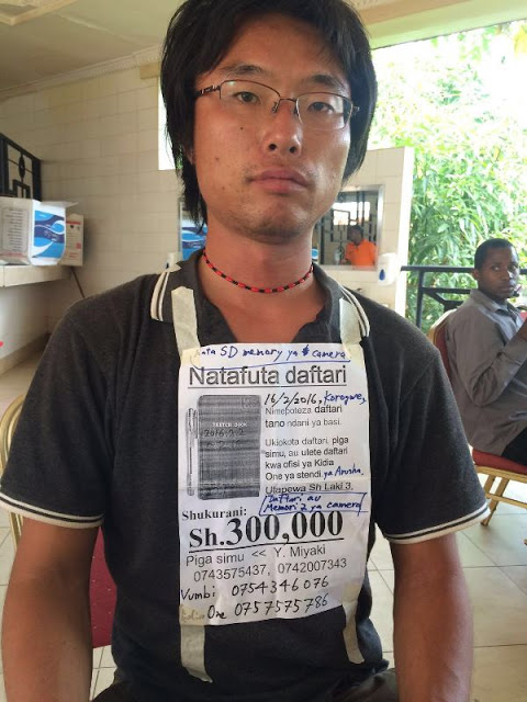 Jana nikiwa Mombo nilimwona kijana mmoja wa kijapan amejibandika matangazo kifuani na mgongoni. Nilimwuliza kulikokoni akanieleza kuwa aliibiwa juzi vitu vyake ndani ya basi la Kidia one akisafiri kati ya dar Arusha. Kamera laptop na daftari 5 among other things. Vitu hivyo ni vina Research work aliyofanya miezi 6. Anaomba Msaada apate daftari zake. Na kama unavyoona yuko tayari kutoa 300,000/-
